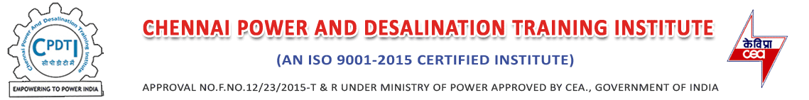CHENNAI POWER AND DESALINATION PLANTS TRAINING INSTITUTE is a CEA (Central Electricity Authority) recognized Institute to impart Operation, Maintenance, Planning, performance monitoring, Permit system, Health and safety training on THERMAL, Combined cycle ,Co generation POWER plants. It imparts Training in various desalination Techniques like SWRO, Multi-effect desalination, Multistage Flashing. Training is provided by highly experienced Power Plant Professionals using state of the art training tools and equipments. Institute provides an excellent ambience which encourages the trainees.